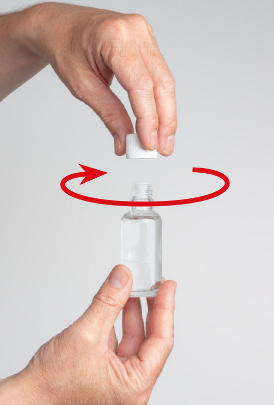 Deschideți flaconul de RAVICTI prin apăsare pe capac urmată de răsucire la stânga.